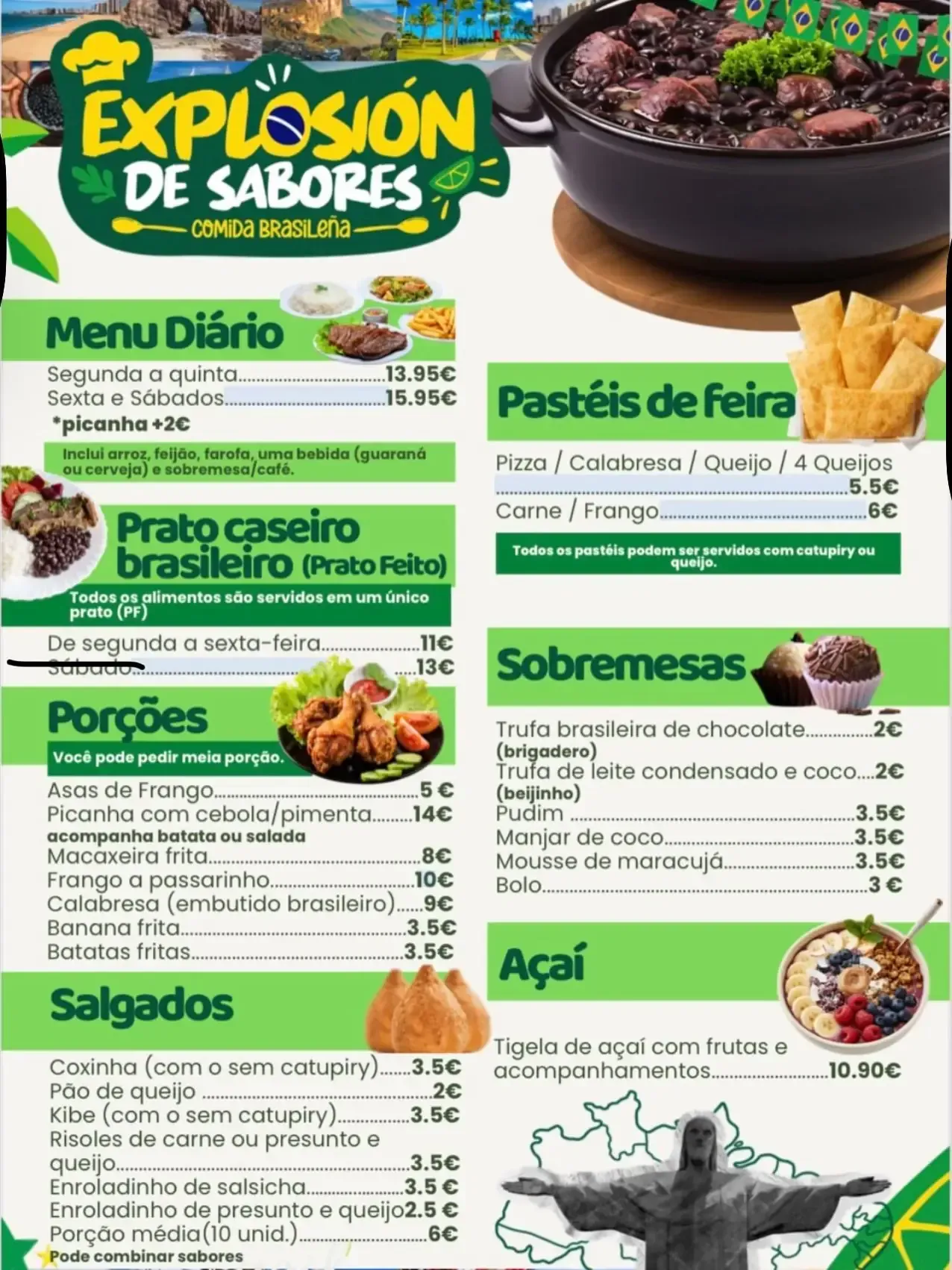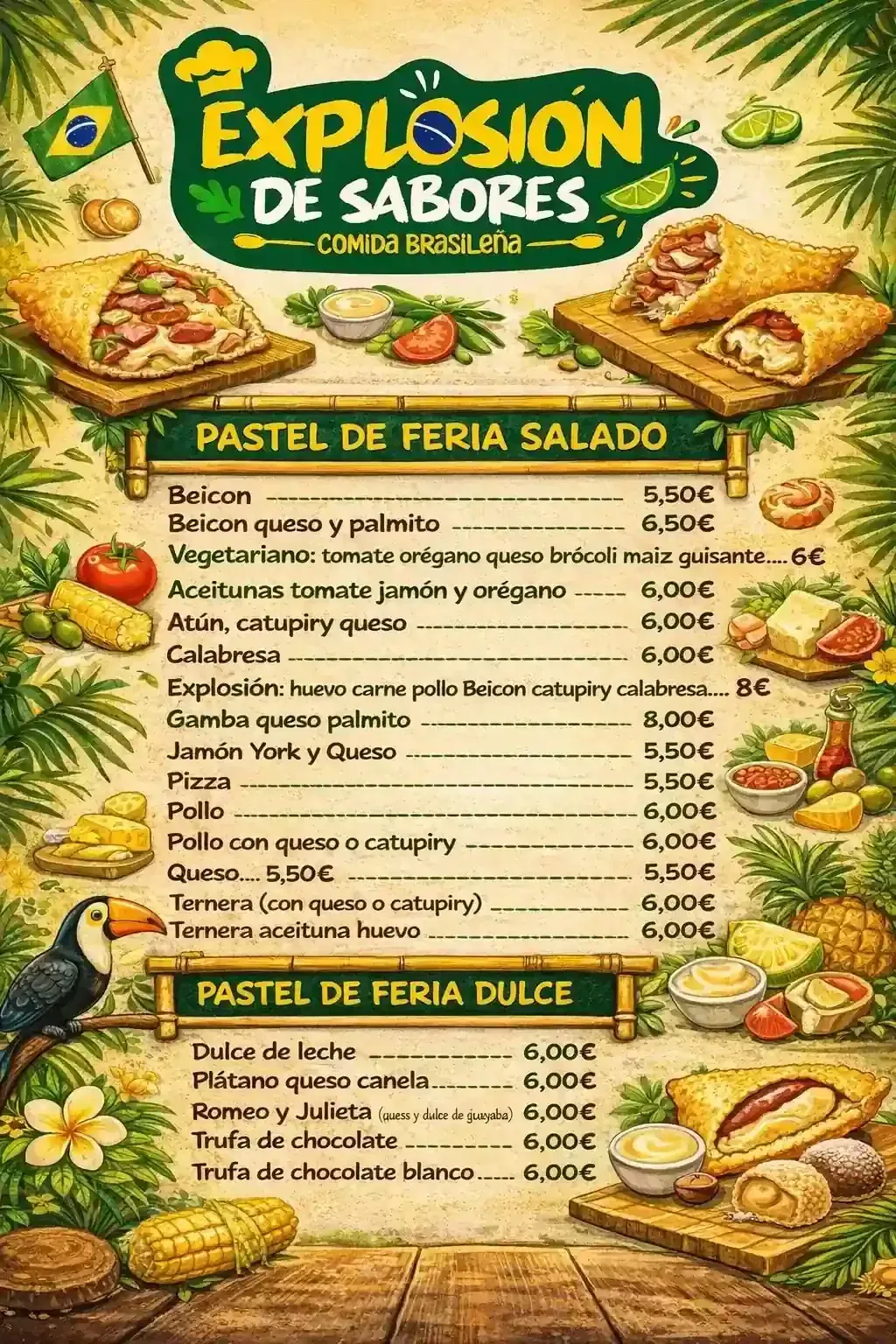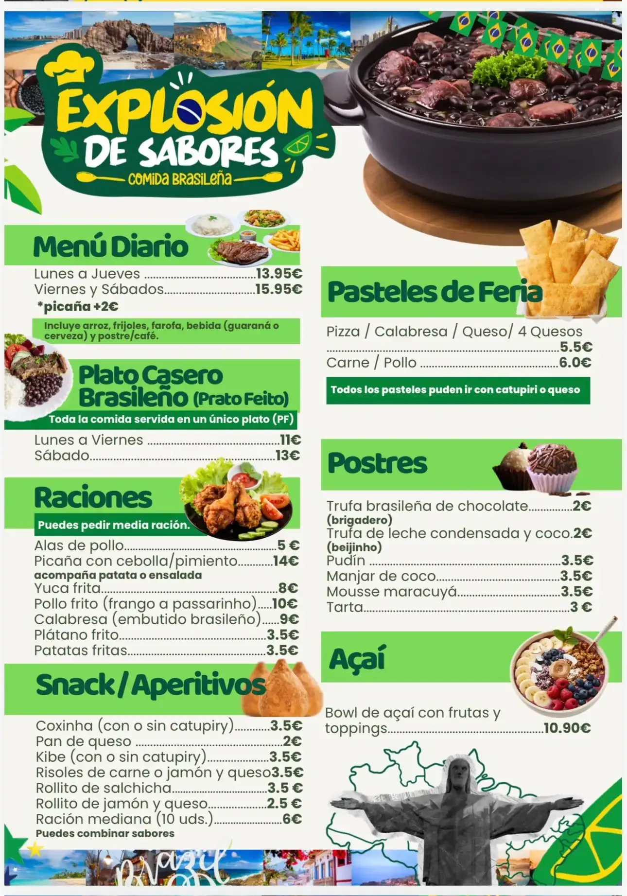 Nuestra carta está pensada para ofrecerte platos tradicionales brasileños, elaborados de forma casera y adaptados al día a día. Apostamos por una propuesta sencilla pero llena de sabor, donde cada plato tiene su protagonismo.